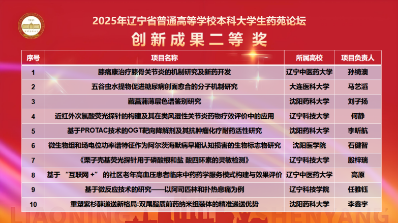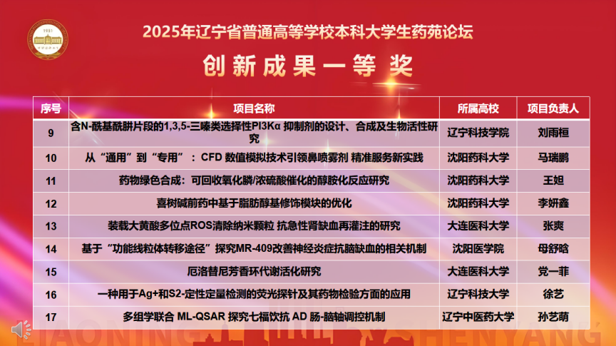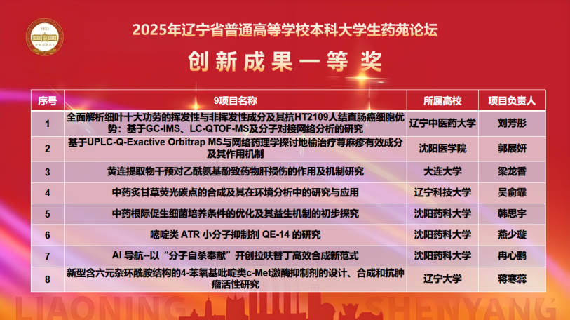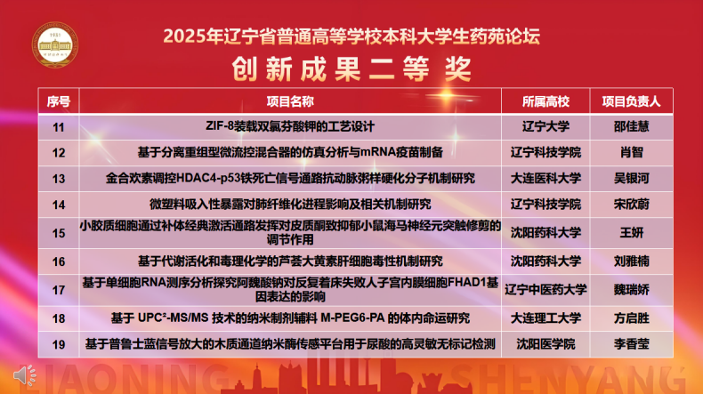 11月7日,由辽宁省教育厅主办、金年会jinnianhuicom承办的“2025年辽宁省普通高等学校本科大学生药苑论坛”在南校区图书馆国为报告厅举行。本次论坛吸引了来自大连理工大学、辽宁大学、大连医科大学等15所兄弟院校的500余名师生参赛,充分彰显了辽宁药学教育领域的蓬勃活力与深厚底蕴。山东大学、大连理工大学、辽宁大学、大连医科大学、金年会jinnianhuicom、辽宁中医药大学、沈阳医学院的专家出席论坛并对参赛项目进行现场评审。