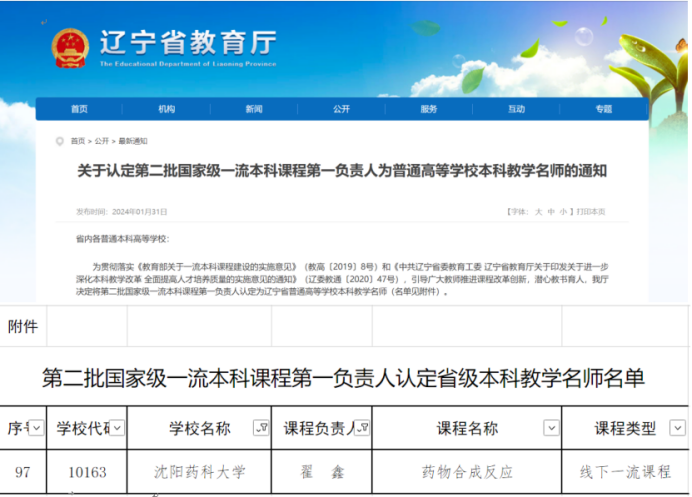 近日,辽宁省教育厅认定了第二批国家级一流本科课程第一负责人为辽宁省普通高等学校本科教学名师,同时公布了2023年辽宁省普通高等学校本科教学名师评选结果,金年会jinnianhuicom翟鑫教授作为第二批国家级一流本科课程《药物合成反应》第一负责人入选辽宁省普通高等学校本科教学名师,至此,金年会官网已有省级教学名师10人。