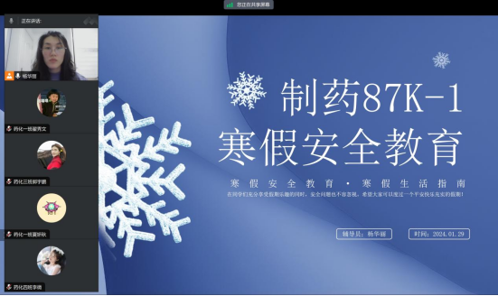 27日至29日,学院辅导员以期队或年级为单位,通过线上会议、安全知识问答竞赛、qq群和微信群推送相关安全信息等方式,向全体本科生及研究生进行安全教育宣讲,并通过学院官方公众号“沈药制药青年之声”面向全院学生发布寒假安全教育文章《“快乐放寒假,安全不放假”||大学生寒假安全提醒》,安全提醒主要包括外出安全、居家安全、防诈骗安全、食品安全四个方面,内容详实,帮助同学们提高安全防范意识和自我保护能力,营造了安全文明的假期氛围,督促同学们牢守安全底线,防患于未然。