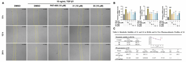 图2. 部分体外药理实验结果和体内药动学实验结果。(A)化合物31和35显著抑制TGF-β1诱导的细胞迁移;(B)化合物31和35降低纤维化相关的基因的表达;(C)肝微粒体和药动学实验结果