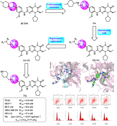 金年会jinnianhuicom侯云雷/宫平课题组采用基于结构的药物设计策略,以BI 2536为先导化合物,运用构象限制和生物电子等排药物设计策略,得到了一系列含噁二唑片段的二氢蝶啶酮类衍生物,其中化合物21g表现出显著的PLK1抑制能力,其IC50值为0.45 nM,并且对多种肿瘤细胞系具有显著的抗增殖活性(MCF-7 IC50=8.64 nM,HCT-116 IC50=26.0 nM,MDA-MB-231 IC50=14.8 nM和MV4-11 IC50=47.4 nM)。此外,化合物21g在小鼠中表现出比BI 2536更好的药代动力学特性(AUC0-t=111227 ng·h·mL-1vs 556 ng·h.mL-1),口服生物利用度为77.4%,并且在Balb/c小鼠急性毒性试验(20 mg/kg)中未观察到明显的毒性。化合物21g可使HCT-116细胞阻滞在G2期,并以剂量依赖的方式诱导细胞凋亡。