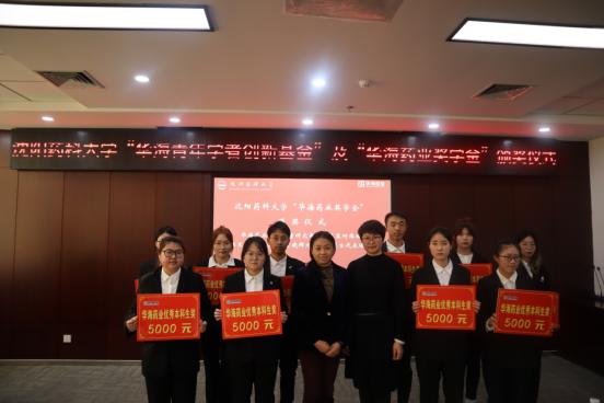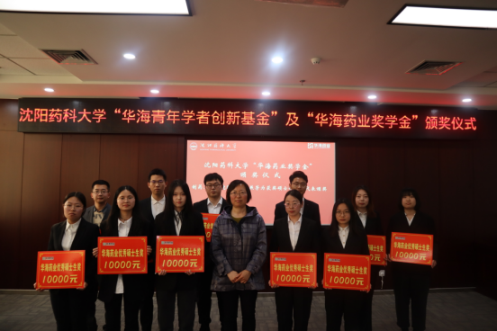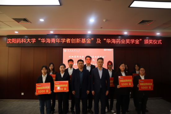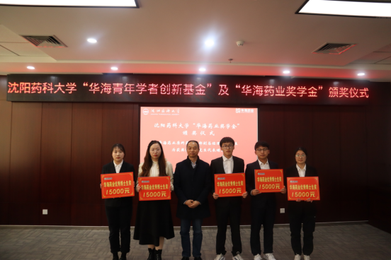 华海药业嘉宾和学校领导为获资助教师和学生颁奖。华海药业人力资源部总监吴野先生为张宇等六名获得“华海青年学者创新基金”的青年教师颁奖。华海药业原料药事业部副总经理朱伟为巩丹丹等五名获得“华海药业奖学金”的博士研究生代表颁奖。金年会jinnianhuicom副院长赵燕芳为王硕等十一名获得“华海药业奖学金”的硕士研究生代表颁奖。华海药业制剂质量研究部高级总监何伟玲、国际销售中心印度业务部总监钟声、国际销售中心人事经理赵仁杰和学校招生就业处副处长董晓辉为王怡等二十名获得“华海药业奖学奖”的本科生代表颁奖。