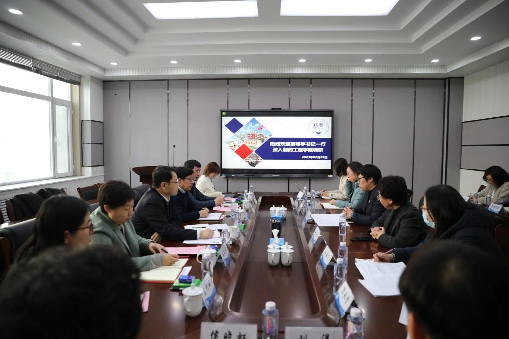 最后,高明宇一行在学院227会议室与学院师生进行了深入座谈。座谈会上,学院院长赵临襄详细介绍了学院发展进程、教师队伍建设情况、本科和研究生教育情况、科研平台、科研项目和成果等方面内容,并对落实辽宁全面振兴新突破三年行动的具体目标和举措,以及师生密切关注的热点、难点等问题进行了汇报。学院党委书记李哲重点介绍了近年来学院党委取得的各项成绩和基层党支部特色,以及未来三年的工作目标和努力方向。学院党委将以党的创新理论为指导努力解决学院发展所面临的实际困难,进一步凝聚思想共识、汇聚强大合力,以高质量党建引领学院高质量发展。学院领导班子其他成员、系主任、教研室主任、辅导员和学生代表分别从新药研发平台建设、课程信息化建设、研究生招生宣传、辅导员队伍建设、学科发展和学生生活等方面提出意见建议。