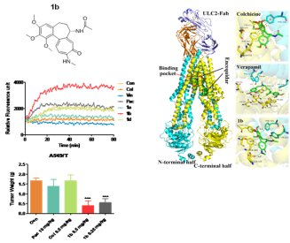 课题组选择对秋水仙碱进行结构修饰,希望提高其治疗指数。选用不同的氨基取代基对秋水仙碱C10位的甲氧基进行取代,合成了一系列化合物。通过比较细胞生长抑制活性及与紫杉醇和长春新碱的交叉耐药性,测试化合物的体内抗肿瘤作用及可能的作用机制。结果表明秋水仙碱C10位甲氨基取代可增强抗肿瘤活性,而羟基取代则丧失了抗肿瘤活性。甲氨基秋水仙碱能够在体内外更有效地抑制肿瘤细胞的生长,且无交叉耐药性。进一步研究表明,其可能的作用机制是以独特的方式与微管蛋白结合,并能够稳定地结合于P-gp蛋白,从而抑制P-gp的功能。该项研究证明甲氨基秋水仙碱是一种新型的微管抑制剂,具有克服紫杉醇和长春新碱耐药性的能力。