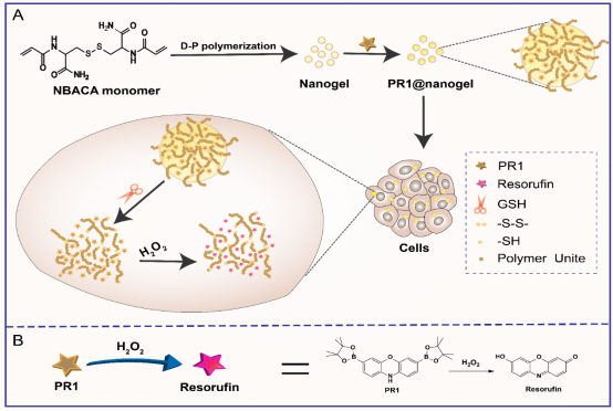 图1. Schematic illustrations for in vivo imaging of H2O2 in living cells via nanohydrogels. (A) Construction of the activable functional reduction-sensitive nanohydrogel loaded PR1 fluorescent probes and its application in living cells for H2O2 detection. (B) Reaction of PR1 with H2O2.