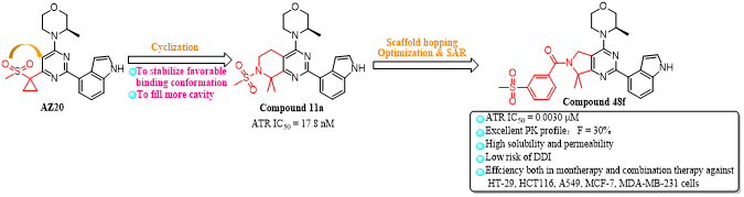 金年会jinnianhuicom赵燕芳/宫平课题组采用基于结构的药物设计策略,以AZ20为先导化合物,通过环合策略、骨架跃迁策略和多轮结构优化,得到了一系列四氢吡啶并嘧啶类衍生物,进一步优化得到了7,7-二甲基-6,7-二氢-5H-吡咯并[3,4-d]嘧啶类衍生物,其中化合物48f对ATR具有优异的抑制活性(IC50= 3 nM),对ATM缺陷的细胞LoVo (IC50= 0.092 μM)、SW620 (IC50= 0.145 μM)、OVCAR-3 (IC50= 0.127 μM)具有显著的抗增殖活性,与AZD-1390、顺铂、奥沙利铂、奥拉帕尼联用具有协同作用,优于阳性对照AZ20。化合物48f以浓度依赖性抑制LoVo细胞的克隆和迁移,且具有良好的药代动力学性质(F = 30%, SD rat)、可接受的PPB (Human: 99.7%, M. fascicularis: 92.1%, Beagle: 97.8%, Rat: 96.1%, and Mouse: 97.6%)和低的药物-药物相互作用风险(CYP1A2:IC50>10 μM, CYP2C9:IC50= 10 μM, CYP2C19:IC50= 1 μM, CYP2D6:IC50> 10 μM, CYP3A4-M:IC50= 1 μM, CYP3A4-T:IC50= 10 μM)。