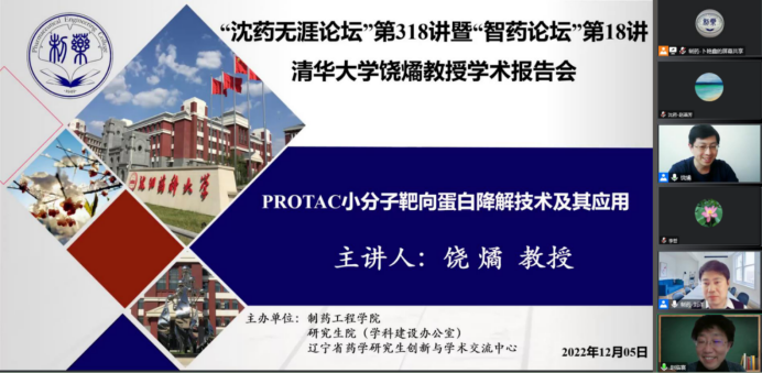 2022年12月5日下午,金年会jinnianhuicom、研究生院、辽宁省药学研究生创新与学术交流中心联合举办了“沈药无涯论坛”第318讲暨“智药论坛”第18讲,清华大学饶燏教授作了题为“PROTAC小分子靶向蛋白降解技术及其应用”的报告。会议由制药工程学科副主席刘洋教授主持,学院领导班子成员、研究生导师和研究生近300余人参会。