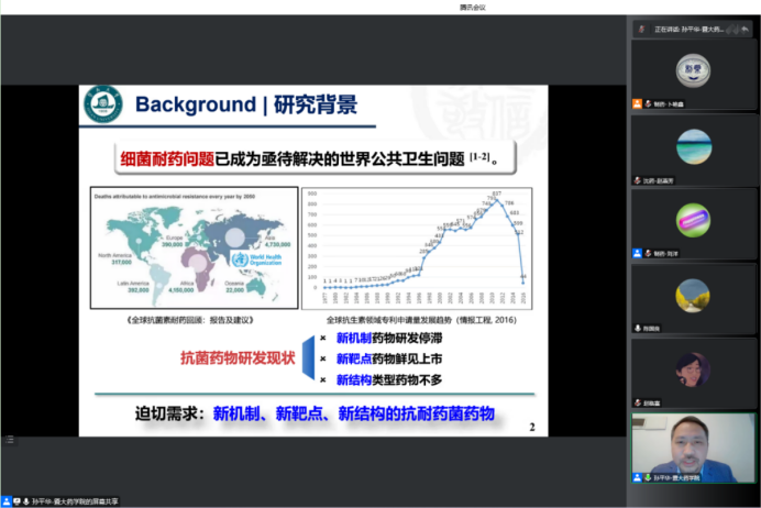 报告会上,孙平华教授对新型抗耐药菌药物的研究热点——针对细菌耐药机制的抗菌增效剂展开详细阐述。他提出,细菌形成生物膜是细菌重要的耐药机制之一,通过抑制细菌生物膜形成、降低细菌耐药性和提升抗生素的抑菌效能,有望解决细菌耐药及难愈性慢性感染问题。孙平华教授长期致力于细菌生物膜抑制剂的设计、合成、活性筛选及机制研究,最新发现的一种双效生物膜抑制剂不仅可以通过作用于铁稳态、导致细菌缺铁,同时作用于群体感应系统、抑制铜绿假单胞菌中毒力因子(弹性蛋白酶、鼠李糖脂、绿脓杆菌素)的分泌。该化合物与与临床使用的抗生素联合使用,可有效地提高多重耐药铜绿假单胞菌对抗生素的敏感性,显示出作为新型抗生素增效剂的巨大潜力。