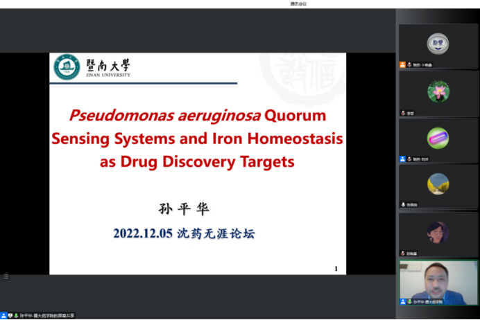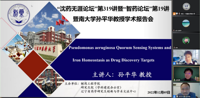 2022年12月5日下午,金年会jinnianhuicom、研究生院、辽宁省药学研究生创新与学术交流中心联合举办了“沈药无涯论坛”第319讲暨“智药论坛”第19讲,暨南大学孙平华教授作了题为“Pseudomonas aeruginosa Quorum Sensing Systems and IronHomeostasis as Drug Discovery Targets”的报告。会议由制药工程学科副主席刘洋教授主持,学院领导班子成员、全院研究生导师和研究生共300余人参会。
