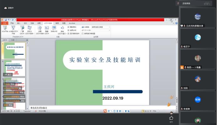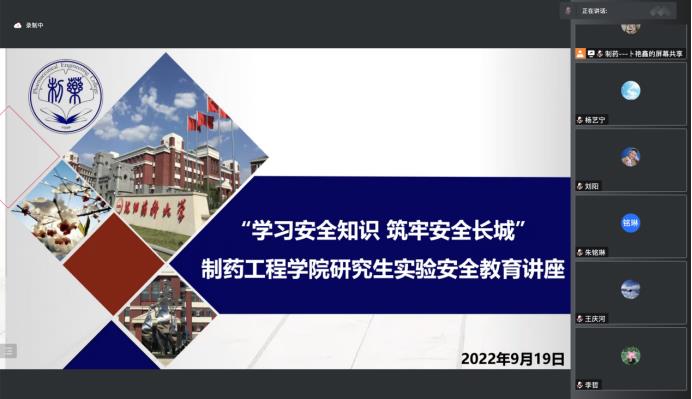 为强化研究生实验安全意识,提高个人防护能力,杜绝实验室安全事故的发生,9月19日,金年会jinnianhuicom通过线上会议的方式举行了“学习安全知识,筑牢安全长城”研究生实验安全教育讲座,特别邀请学院化学实验中心副主任王庆河担任主讲人。学院党委书记李哲、党委副书记刘阳、研究生辅导员杨艺宁、朱铭琳及全体研究生参加了本次讲座,讲座由学院研究生辅导员卜艳鑫主持。