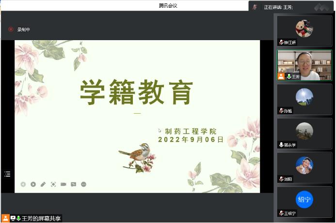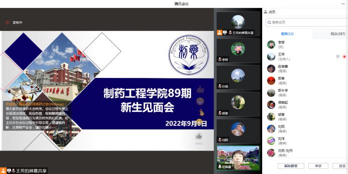 2022年9月6日晚,金年会jinnianhuicom依托腾讯会议召开了89期新生见面会。学院院长赵临襄、院党委书记李哲、副院长赵燕芳、副院长郭永学、副院长王绍宁、院党委副书记刘阳、院长助理刘洋、药物化学专业负责人郭春、环境科学专业负责人侯晓虹、应用化学专业负责人胡春、药物化学系主任刘丹、环境科学教研室主任张聪璐、教学秘书王芳以及89期1期队辅导员钟江妍出席了本次会议。会议由89期2期队辅导员孙旭主持,学院89期全体新生参加。