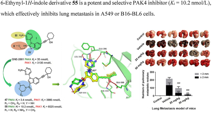 金年会jinnianhuicom程卯生教授团队在X射线结晶学和结构优化的指导下,通过对先导化合物进行多轮结构优化,得到了一系列3-取代-6-取代乙炔基-1H-吲哚类化合物。作为II类PAKs抑制剂,该系列化合物对PAK4蛋白激酶具有显著的抑制活性和特异性。其中,化合物55对肺癌细胞株A549和黑色素瘤细胞株B16在2.5μM浓度下的迁移抑制率大于40%和60%,优于阳性对照GNE-2861,表现出优异的抗迁移和抗侵袭性能;体内药动实验表明,化合物55在小鼠体内具有适中的半衰期与代谢速率;在裸鼠A549和B16-BL6移植瘤肺转移模型中,化合物55对肺表面转移结节的抑制率分别超过80%和90%。机制研究表明,化合物55减轻转化生长因子-β1诱导的上皮-间充质转化,能够有效抑制肿瘤的迁移、侵袭及转移行为。