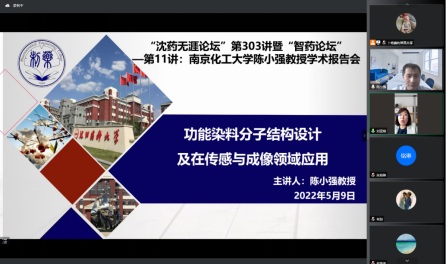 5月9日,由金年会jinnianhuicom、研究生院、辽宁省药学研究生创新与学术交流中心联合举办了“沈药无涯论坛”第303讲暨“智药论坛”第11讲。邀请南京工业大学化工学院陈小强教授做了题为“功能染料分子结构设计及在传感与成像领域的应用”的学术报告。会议由金年会jinnianhuicom药物化学教研室主任刘亚婧主持,100余人参加了此次学术会议。