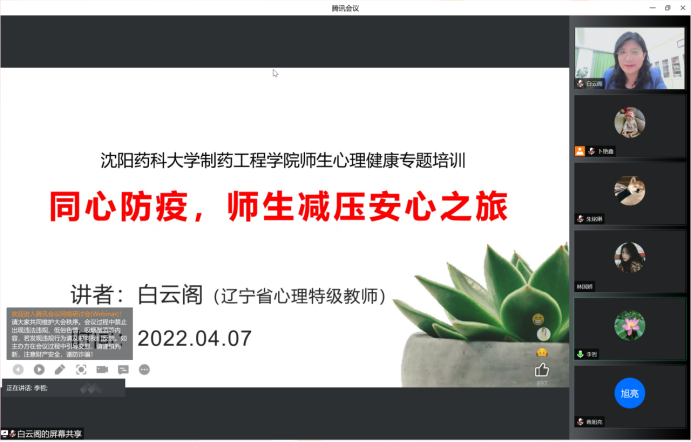 为深入贯彻落实学校疫情防控工作领导小组关于加强心理疏导工作的部署要求,强化疫情防控期间金年会官网全体师生心理健康工作,不断加强研究生心理健康教育和疏导,提高学生在疫情防控期间心理健康自助、互助能力,全面保障学习生活平稳有序进行。4月7日,金年会jinnianhuicom举办了主题为“同心战疫 温暖前行”———心理防疫,师生减压安心之旅心理健康讲座,邀请辽宁省心理特级教师白云阁博士开展线上心理健康讲座,全院500余师生参加了此次心理健康讲座,会议由金年会jinnianhuicom党委书记李哲主持。