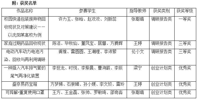 本次大赛旨在提高大学生综合素质和创新实践能力,向大学生传递可持续发展和生态环保理念,激发大学生的创新意识、环保意识和社会责任感,贯彻十九大精神,明确“生态兴则文明兴”的新目标,推动绿色发展,共同实现“和谐生态,绿色发展”的梦想,促进人与自然和谐共生,持续推进生态文明建设。环境科学教研室自接到大赛通知以来。积极动员、全面备赛。学生踊跃报名,教师悉心指导,共设计完成6组作品报送大赛组委会。最终,参赛作品《校园快递包装废弃物回收现状及对策建议—以沈阳某高校为例》荣获一等奖,《家庭过期药品回收现状》、《电动汽车动力电池污染、回收与再利用调研》荣获三等奖。