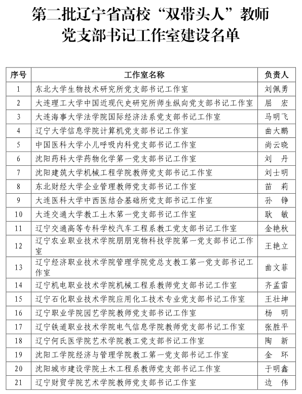 近日,辽宁省委教育工委办公室发布《关于公布第二批辽宁省高校“双带头人”教师党支部书记工作室建设名单的通知》,全省21个本、专科高校教师党支部工作室位列建设名单。其中,由药物化学教研室主任刘丹教授负责的金年会jinnianhuicom药物化学第一党支部书记工作室成功入选第二批辽宁省高校“双带头人”教师党支部书记工作室。