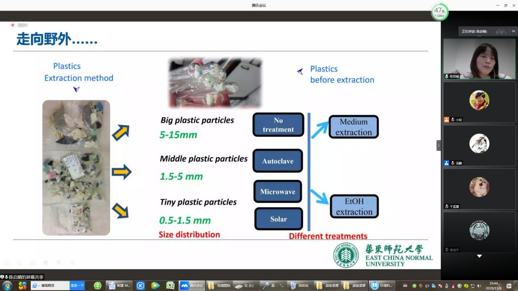 在线上分享中,陈启晴校友首先简明扼要地汇报了个人的求学经历和科研成长之路。然后深入浅出、详尽地介绍了水环境中微塑料、纳米材料及其复合污染的生物效应研究,通过识别水环境中塑料残骸上的有机污染负载特征,建立了微塑料“载体”作用的潜在风险评估和预测方法。陈启晴校友关于微塑料的研究成果填补了我国在塑料负载有机污染物的复合污染特征方面的空白,为塑料废弃物的管理和塑料污染治理提供了坚实的科学依据,奠定了坚实的理论基础。陈启晴校友以个人的成长经历为在校的学弟学妹们、尤其是考研同学树立了科研之路的典范,更坚定了他们走科研道路的决心和信心。陈启晴校友精彩的科研分享在与会学生中引起强烈反响。参会的同学们分别就关心的微塑料降解、PPCP毒理研究现状、同济大学环境类研究方向、学业规划等问题与陈启晴学姐展开了亲切愉快的交流。同时,陈启晴校友表达了对环境科学专业教师的深深感谢,正是老师们一直以来的专业自信才促使她毕业后坚决选择环境科学专业读研;正是环境科学专业特色鲜明人才培养模式,才使得她在后来的科研路上思路开阔。陈启晴校友的精彩分享,对环境专业学生的学业和科研成长规划具有重要指导意义,大大提升了学生本专业深造的信心。最后,环境科学教研室教师就校际合作、聘请兼职导师、科研交流合作等方面进行了深入探讨,并达成初步共识。
