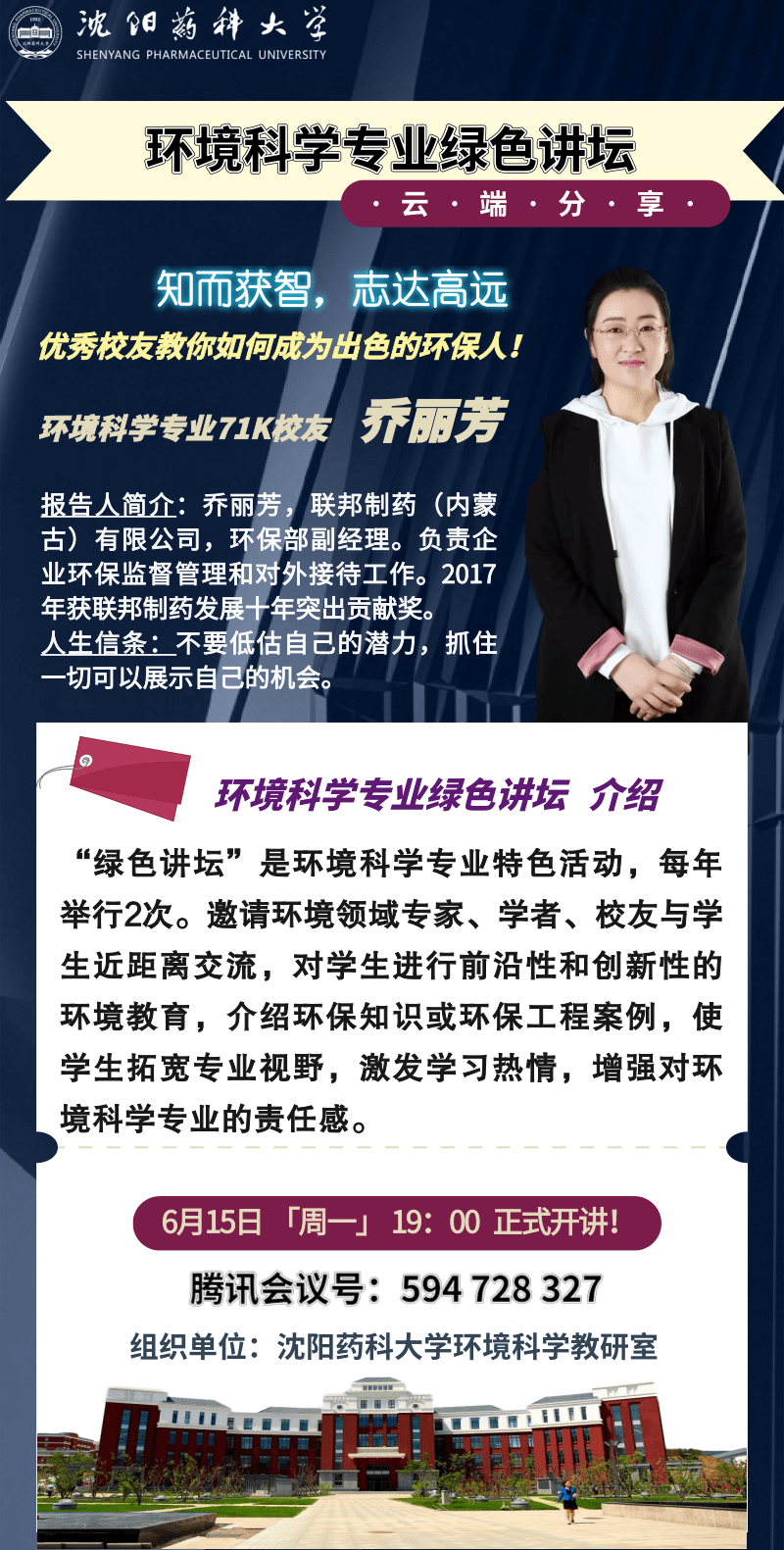 2020年6月15日19点,金年会jinnianhuicom环境科学教研室组织举办了“环境科学专业绿色讲坛”云端分享活动。“绿色讲坛”活动是环境科学专业的特色活动,每年举行2次,邀请环境领域专家学者或优秀校友与环境科学专业学生近距离交流,对学生进行前沿性和创新性的环境教育,使学生拓宽专业视野,增强对环境科学专业的责任感和认同感。同时,更为发挥优秀校友的榜样作用,引导和激励在校生志存高远,奋发成才。本次活动邀请了金年会官网环境科学专业71K毕业生、现任联邦制药(内蒙古)有效公司环保副经理乔丽芳做了题为“知而获智,志达高远”的个人成长事迹精彩分享。活动由环境科学专业负责人侯晓虹教授主持,环境科学教研室全体教师、环境科学专业四个年级在校生、以及其他环境科学毕业校友,共计160余人参加了此次云端盛会。