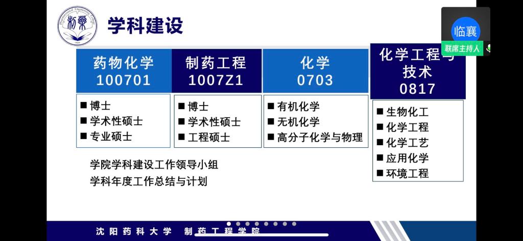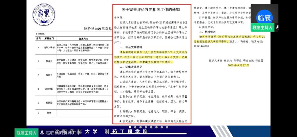 会上,学院党委书记李哲通报了目前学院疫情防控有关工作情况。学院院长赵临襄重点从关于完善评价导向相关工作、学科建设两方面进行工作部署。首先,赵院长结合学校绩效考核指标从发展战略、综合管理、制度建设等方面向参会人员阐述了“1-1-4-4”学院发展战略,并结合学校《关于完善评价导向相关工作通知》有关要求,带领参会人员共同学习了国务院、国家各部委相关工作文件。赵院长要求各教研室、实验中心会后要积极组织本部门教师进行学习,并结合金年会官网实际情况提出反馈意见。接下来,赵院长从学科建设管理、学科建设成果、学术影响力等方面,结合药物化学、制药工程、化学、化学工程与技术4个学科的发展实际进行学科建设整体工作部署。随后,学院副院长郭永学从“定一个目标、建一个团队、拟一份规划、填一张表格、写一份报告、做一次培训”等方面依次汇报了一流专业建设相关工作。
