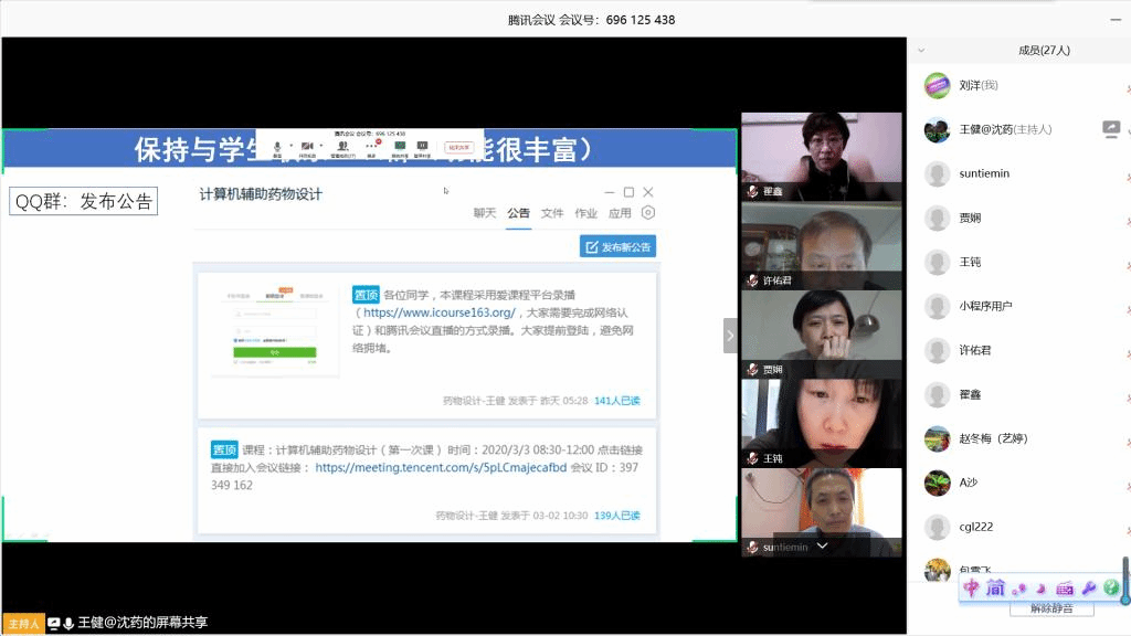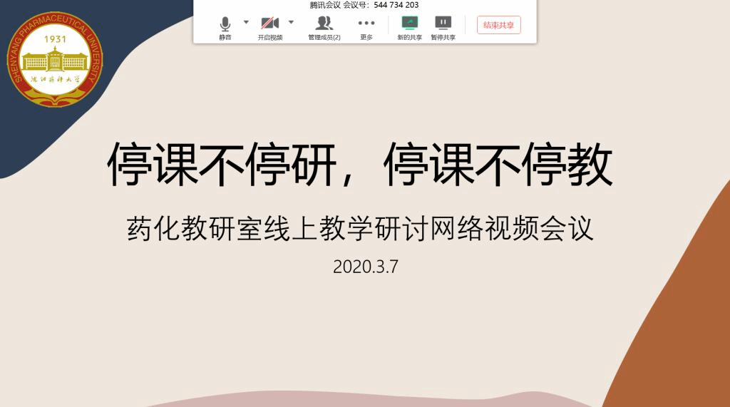 在新冠肺炎疫情防控工作的关键时期,金年会jinnianhuicom药物化学教研室积极响应教育部和校党委关于“停课不停教,停课不停学”的号召,于3月7日上午应用腾讯会议平台,召开网络视频工作会议,切实落实学校关于“扎实做好线上教学工作”的总体要求,研讨本科生理论课程网络教学的相关要点。会议由教研室主任刘丹教授主持,教研室26位一线教师全部出席会议。
