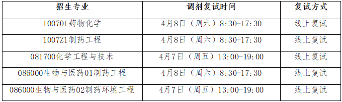 (一)复试专业代码及名称:100701药物化学、1007Z1 制药工程、086000-01生物与医药(制药工程)