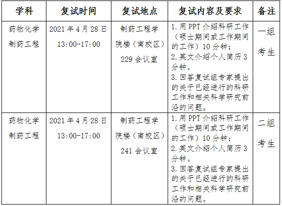 在学校研究生招生工作领导小组的组织和领导下,成立制药工程学院研究生招生复试工作领导小组,各学科分别成立考核小组。领导小组负责统筹管理各学科考核小组工作,考核小组负责各学科考核工作的具体开展。