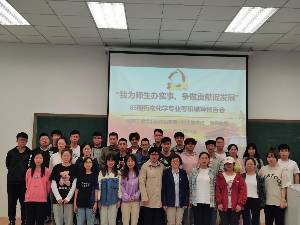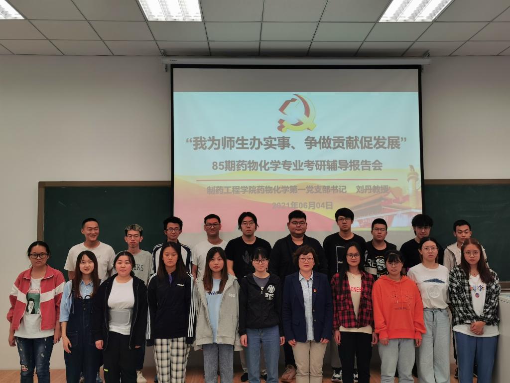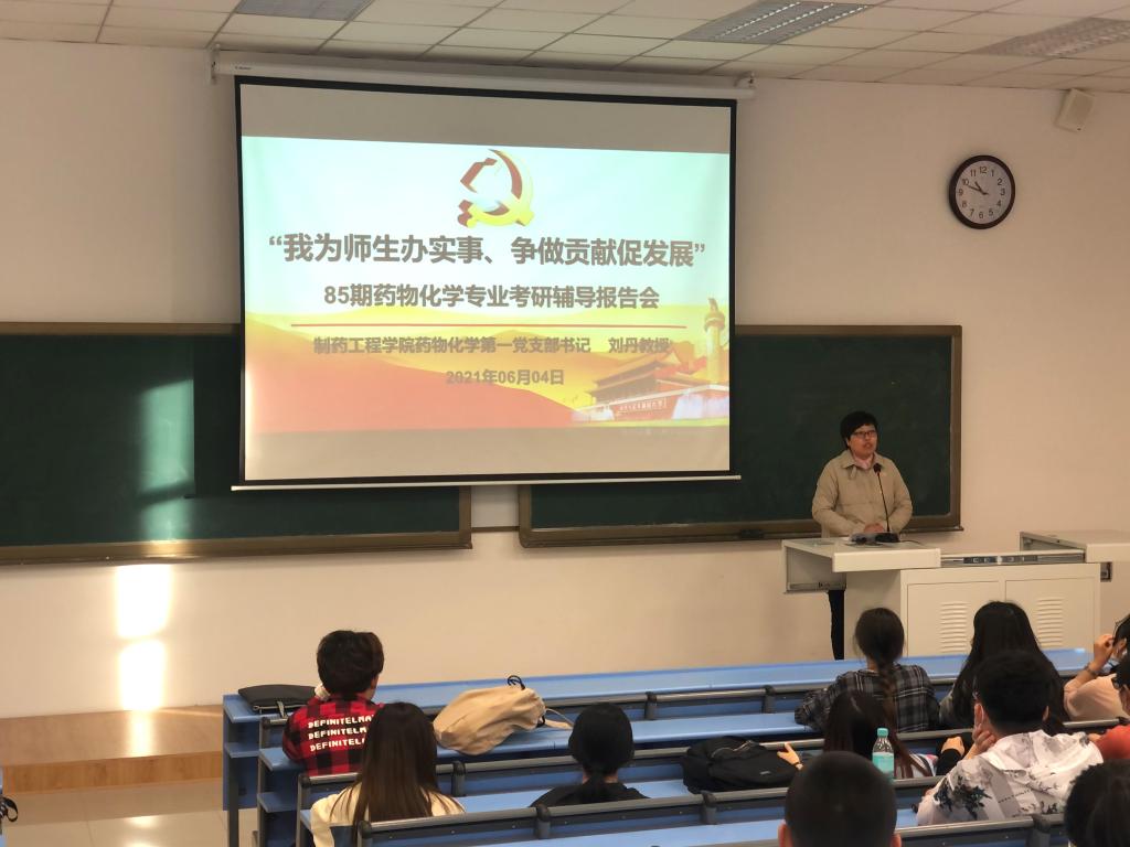 为更好地促进党史学习教育走深走实,充分发挥金年会jinnianhuicom药物化学第一党支部辽宁省高校“双带头人”教师党支部书记工作室的示范作用,将“我为师生办实事 争做贡献促发展”落到实处,6月4日晚,在第四教学楼204教室,药化第一党支部书记刘丹教授为85期药物化学专业学生做考研辅导报告,药化一班、药化二班共55名有意向参加考研的同学参与了此次考研指导会。院党委书记李哲出席并主持报告会。