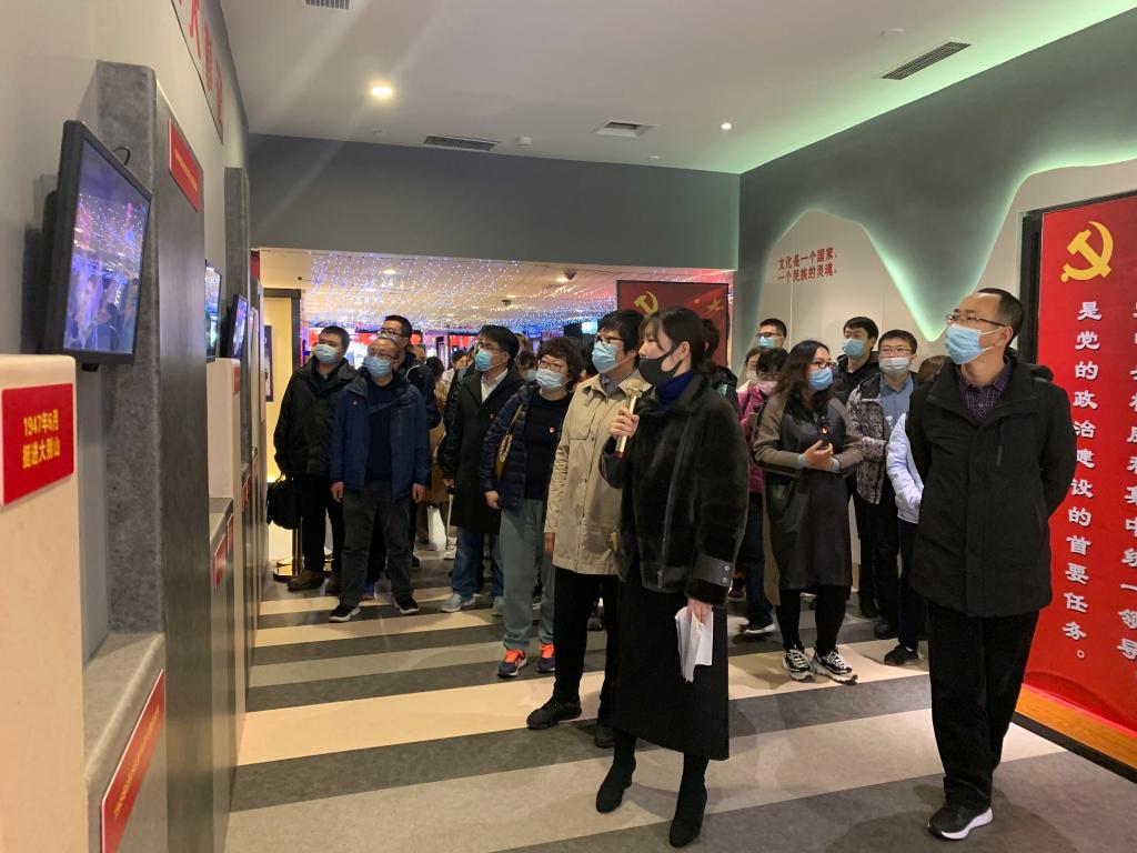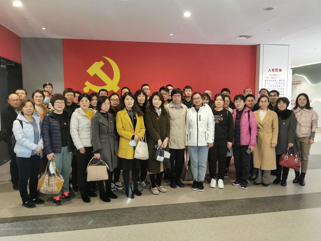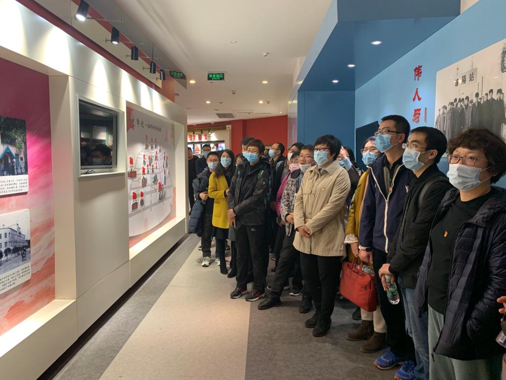 首先,在讲解员的带领下,教工党员、入党积极分子以动态视频、VR虚拟现实技术展示的方式,依次参观了党史大事视频展、革命场景VR展、红色爱党爱国影片展、沈阳市和平党史地图展等。